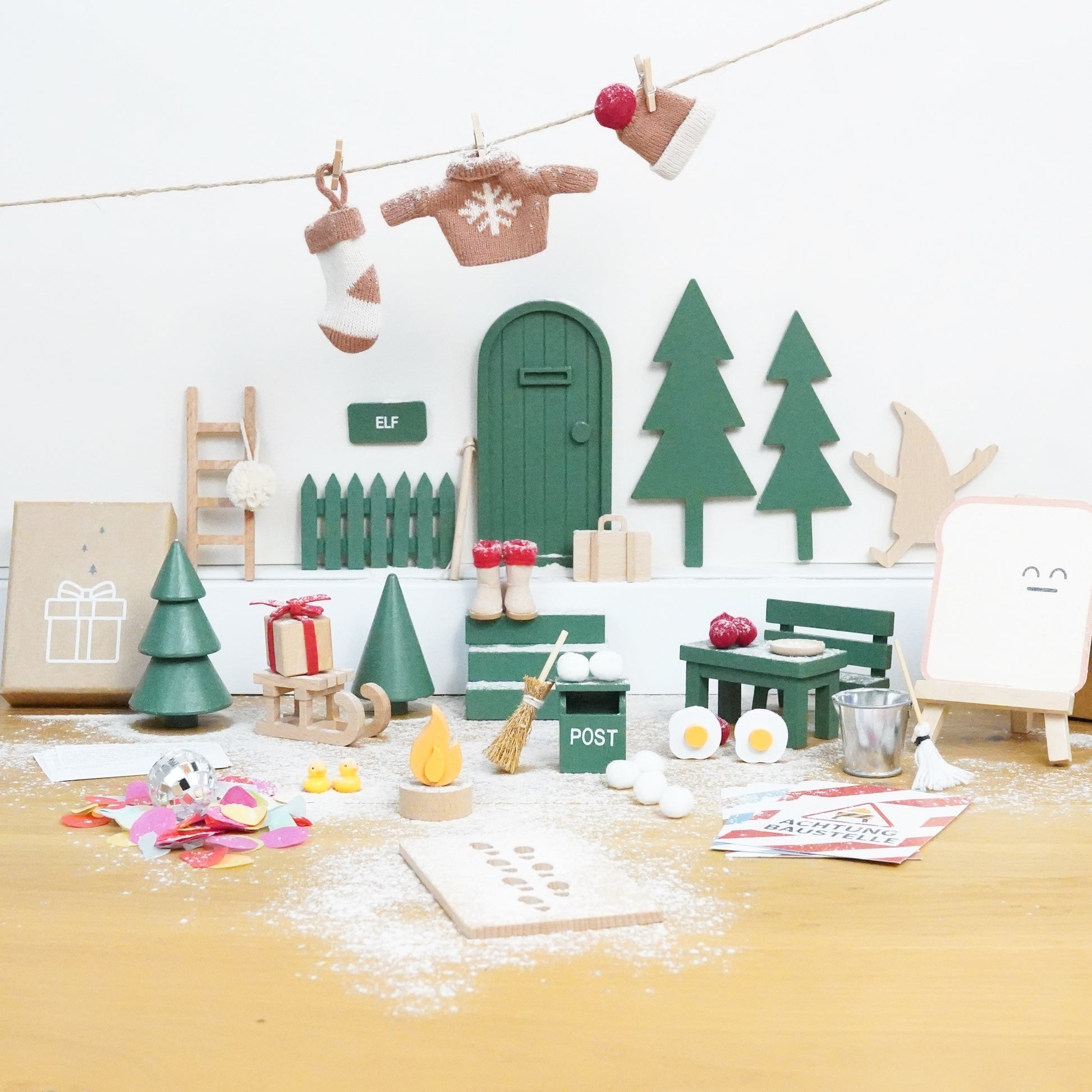 Tür | Treppenblöcke | Zaun | Flache Tannenbäume | 3D Tannenbäume | Namensschild | Briefkasten | Bank | Tisch | Stiefel | Geschenk | Klebepunkte | Aufbewahrungsbeutel