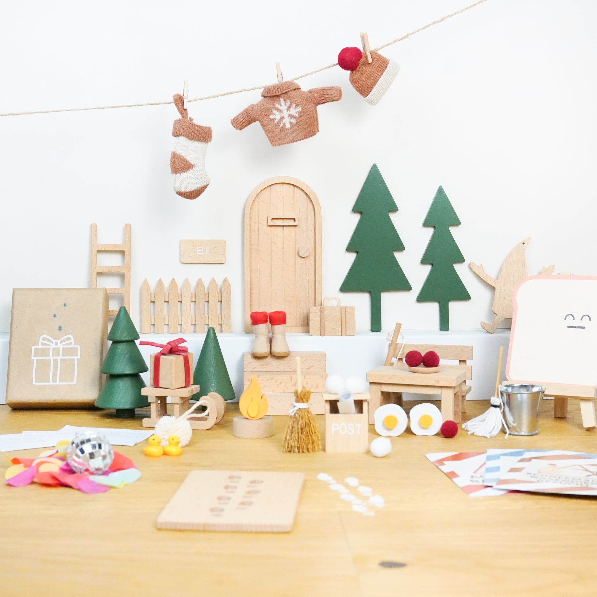 Wichteltür: das Zuhause des Weihnachtswichtels inkl. Tür, Treppe Zaun, Tisch, Bank, Bäumen, Deko, Schuhen.
