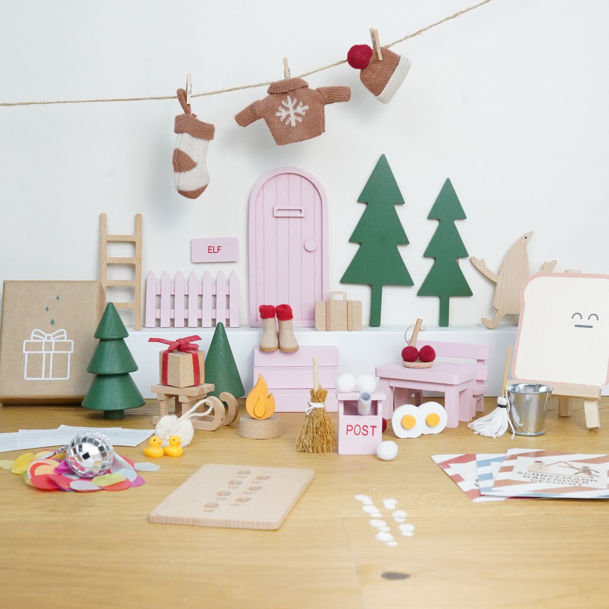 Wichteltür: das Zuhause des Weihnachtswichtels inkl. Tür, Treppe Zaun, Tisch, Bank, Bäumen, Deko, Schuhen.