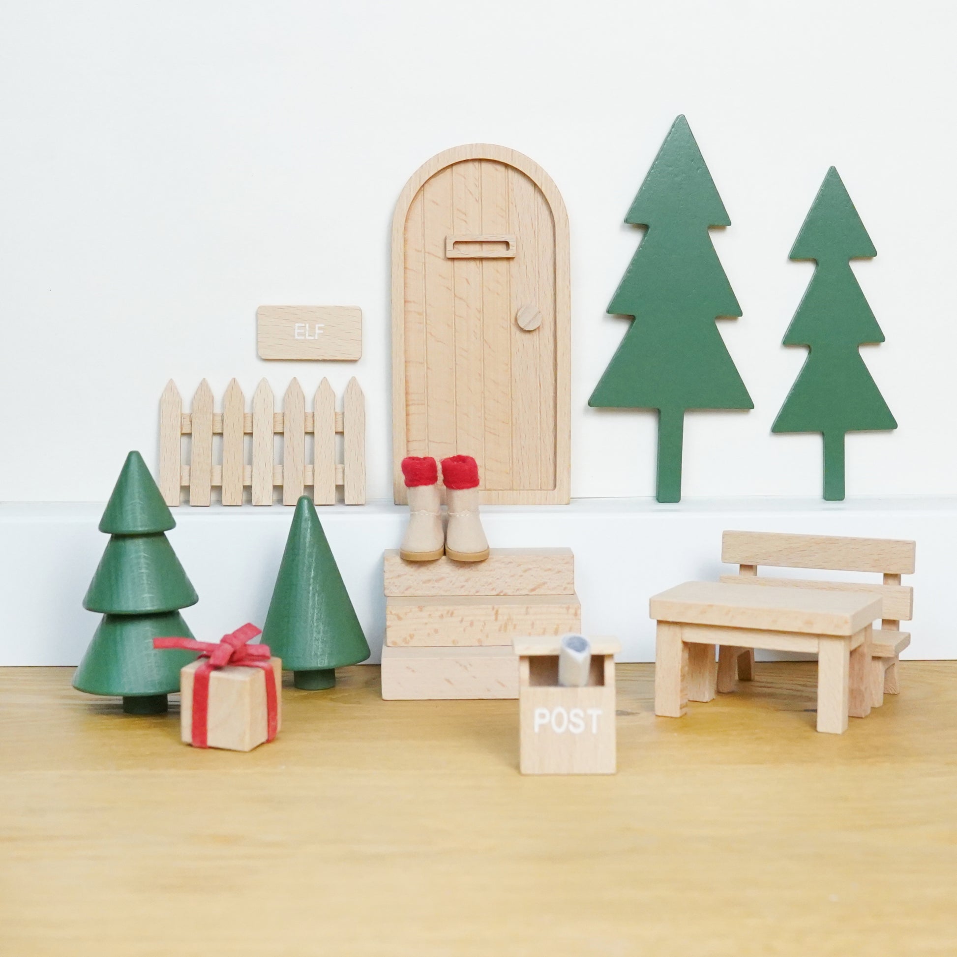 Wichteltür: das Zuhause des Weihnachtswichtels inkl. Tür, Treppe Zaun, Tisch, Bank, Bäumen, Deko, Schuhen.